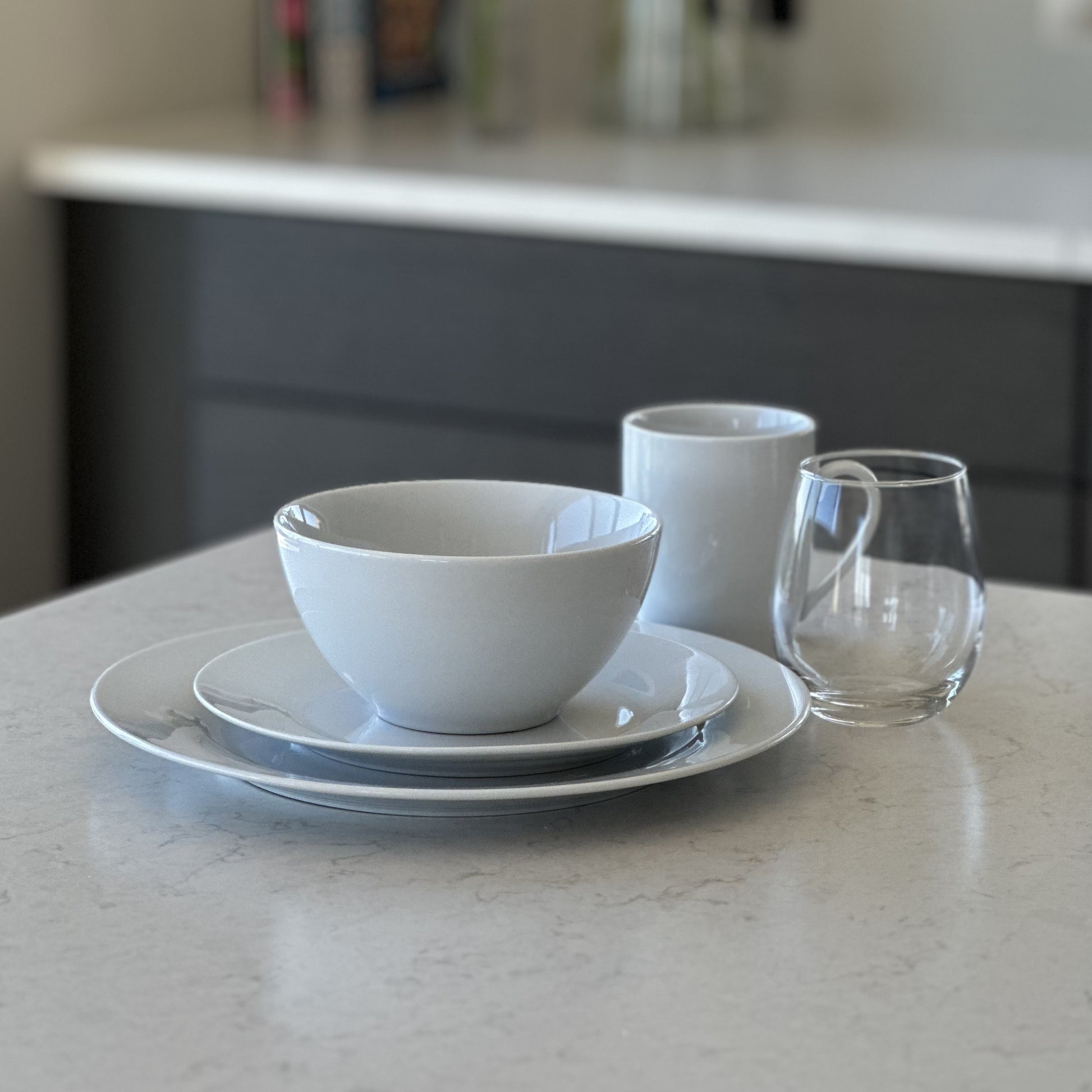 4 frokosttallerken, 4 middagstallerken, 4 skåler og 4 kopper. 4 vannglass. 4 vannglass 390ml.