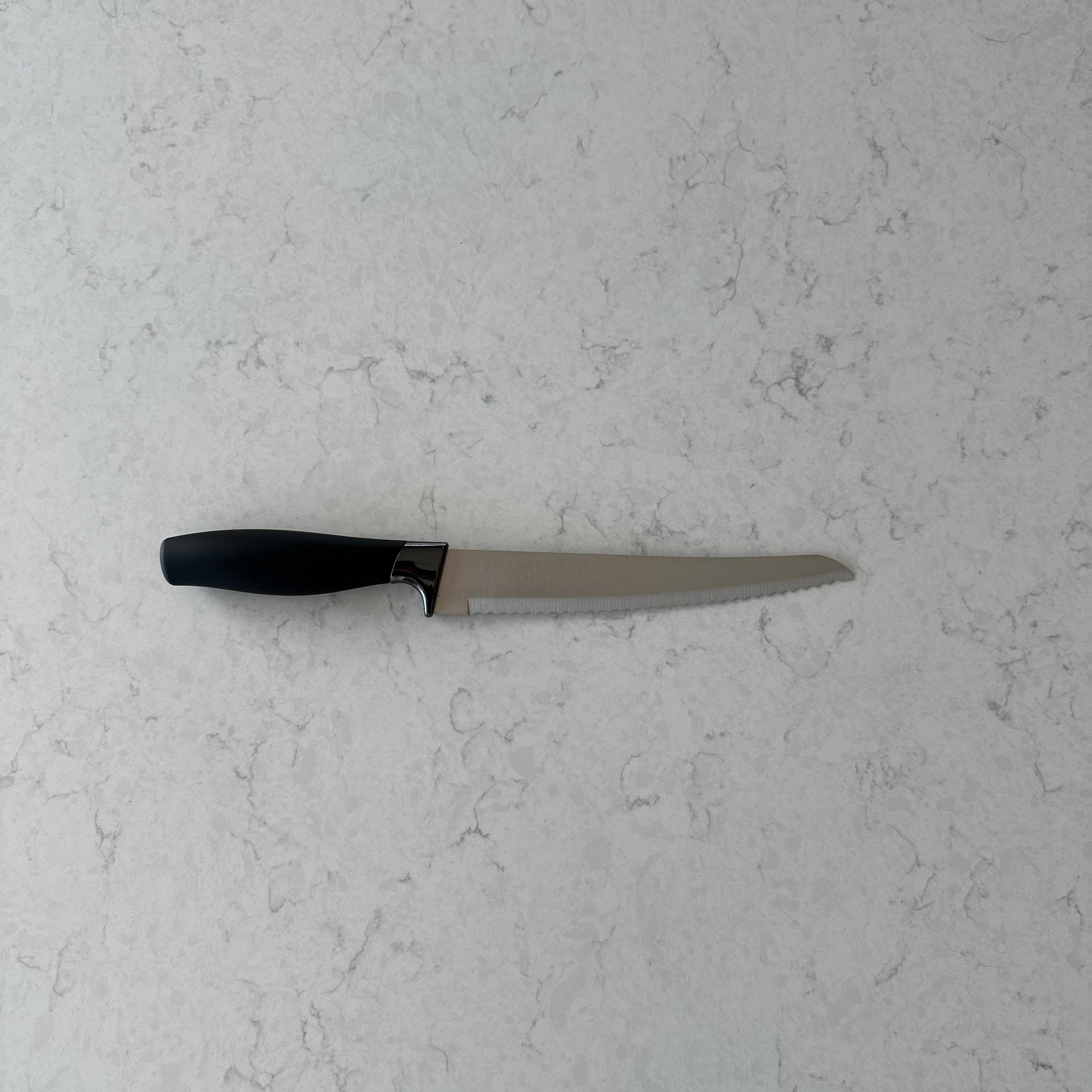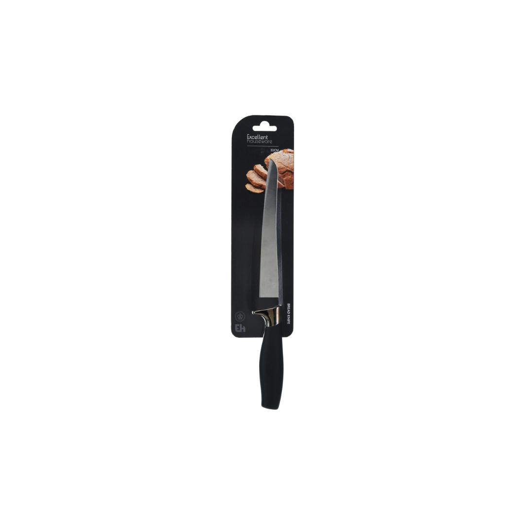 Brødkniv med sort skaft og blad av rustfritt stål.