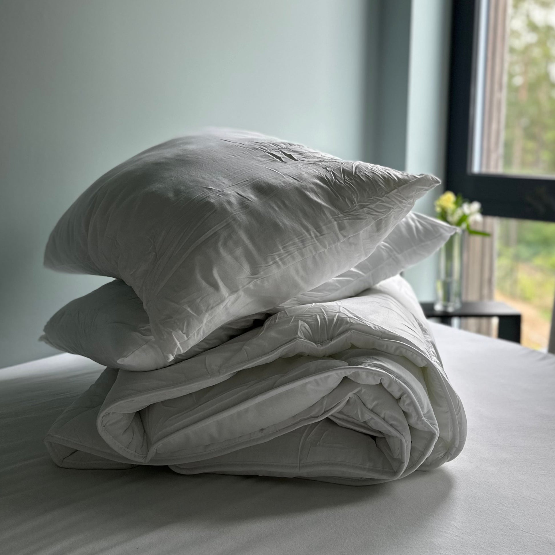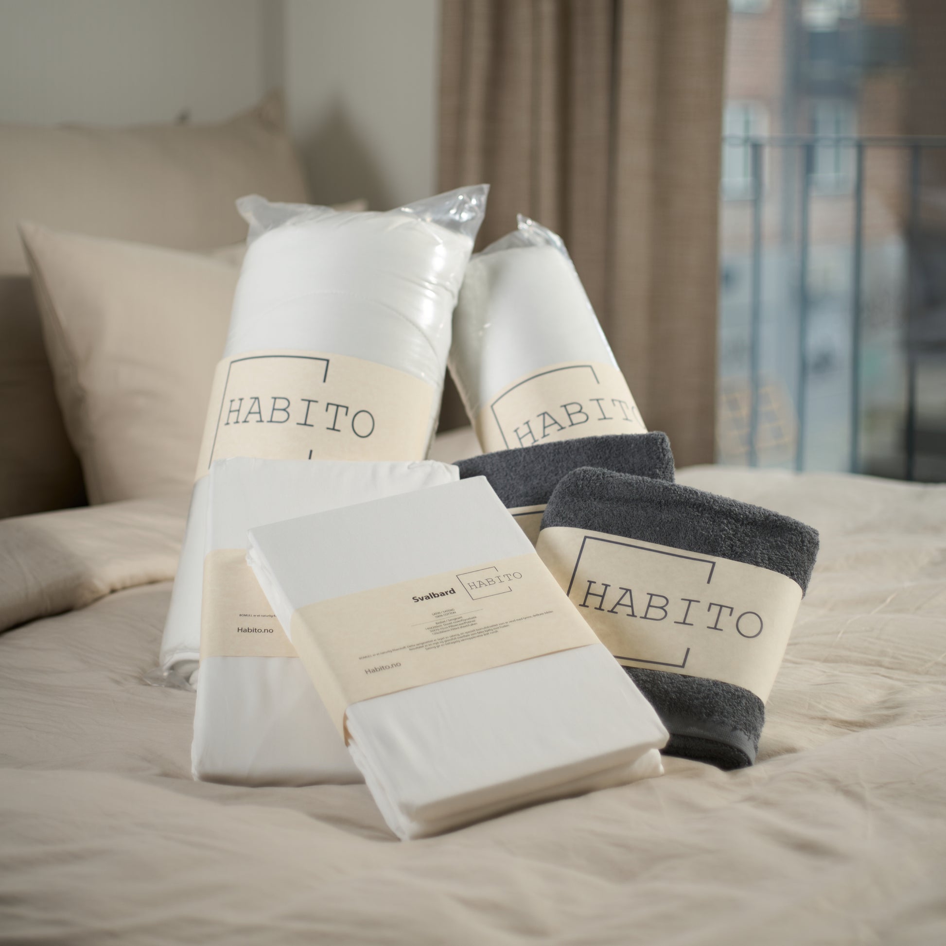 I denne pakken får du et fullt sengesett, inkludert dyne og pute og håndklær. Sengesettet er i deilig sateng, et naturlig og pustende materiale som kombinerer komfort og eleganse. Stoffet gir en glansfull overflate som føles kjølig mot huden. Laken og håndklær er i 100% bomull.