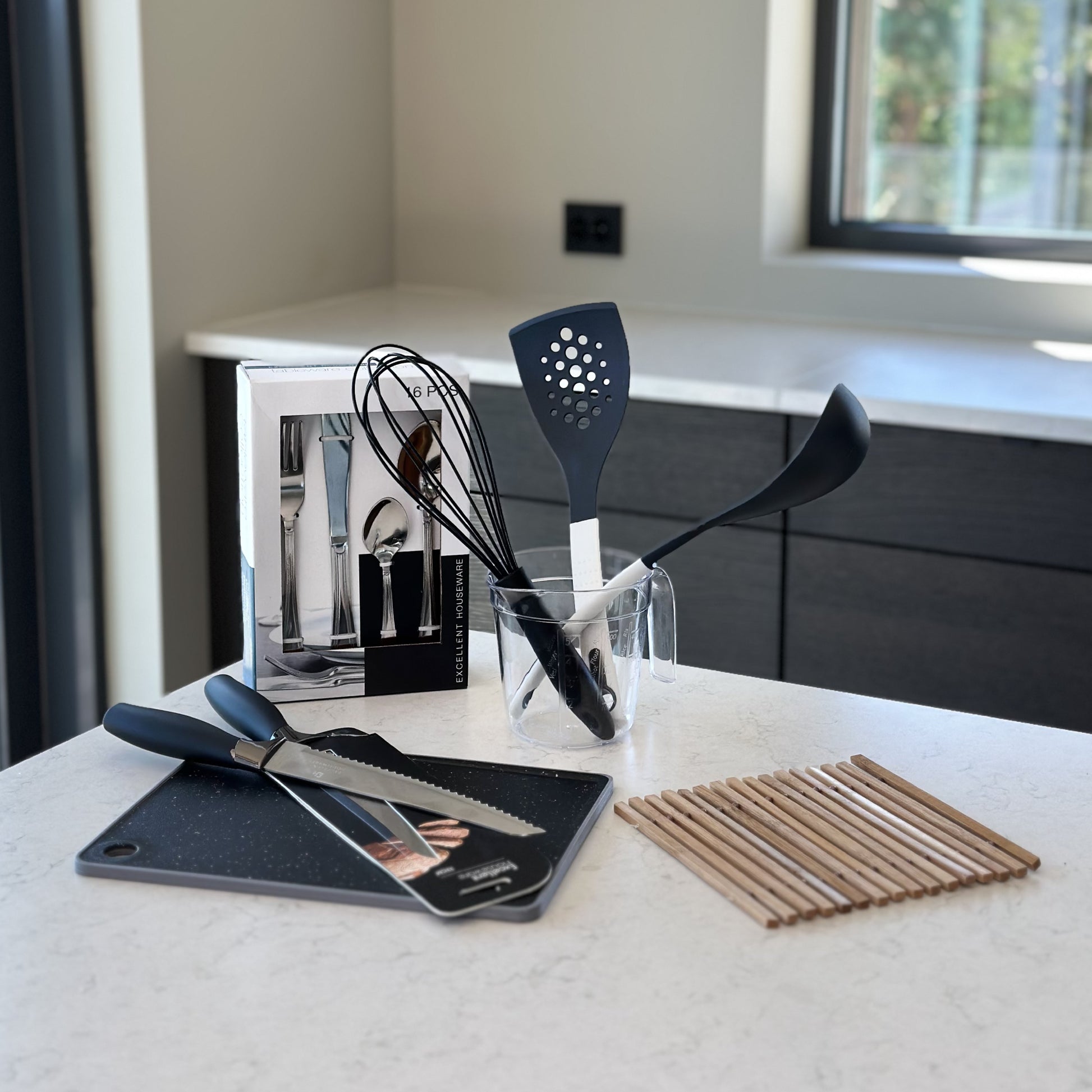 Bestikk, kokkekniv, brødkniv, stekespade, øse, visp, fjøl, desilitermål, kjeleunderlag, grytekluter og kjøkkenhåndklær.