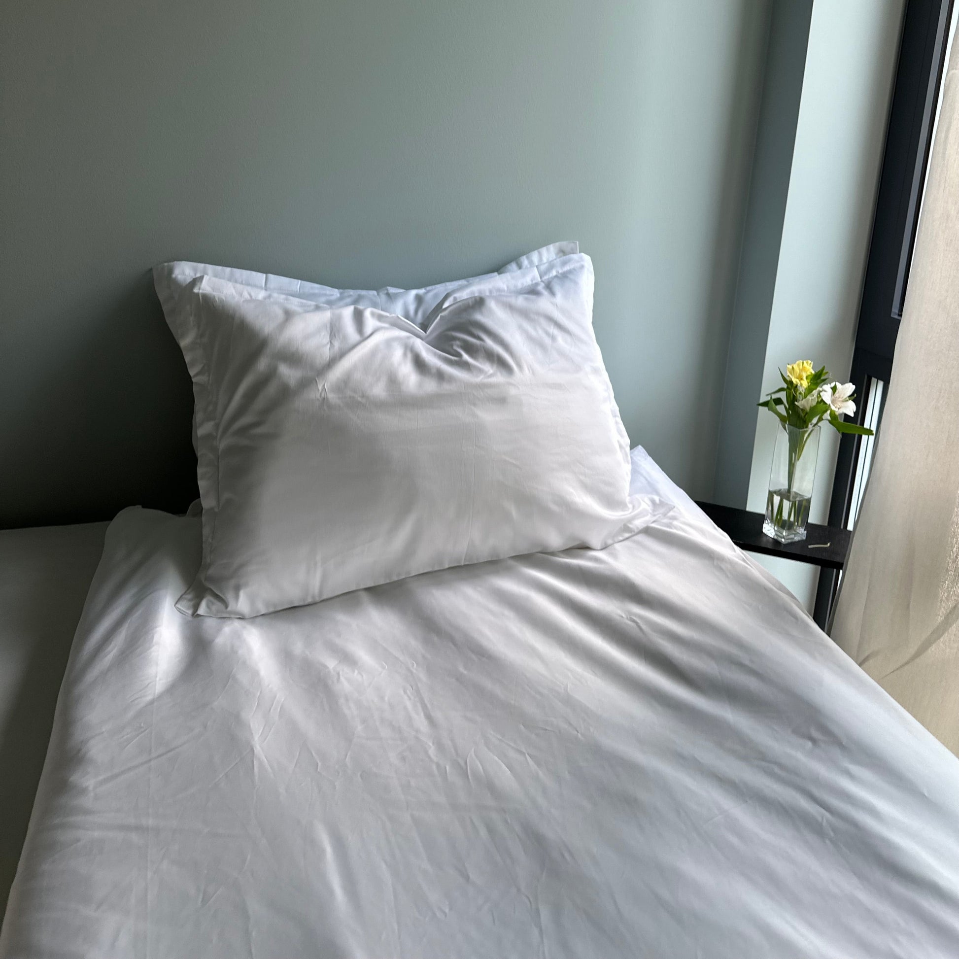I denne pakken får dynetrekk, putetrekk, laken og to håndklær. Sengesettet er i deilig sateng, et naturlig og pustende materiale som kombinerer komfort og eleganse. Stoffet gir en glansfull overflate som føles kjølig mot huden. Laken og håndklær er i 100% bomull.