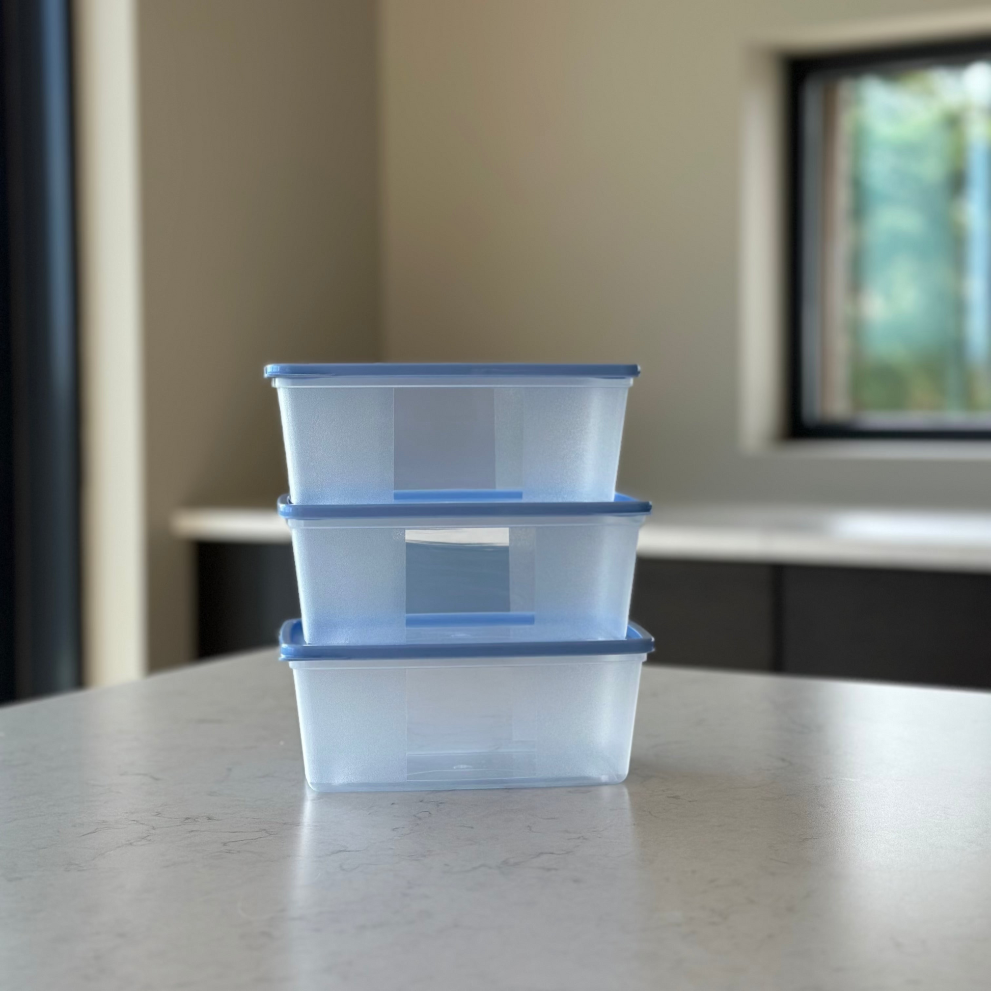 Tre 0.8 liter oppbevaringsbokser for mat som tåler temperaturer fra -40 grader til +120 grader. Denne oppbevaringsboksen tåler mikroovn, kjøleskap og fryser.