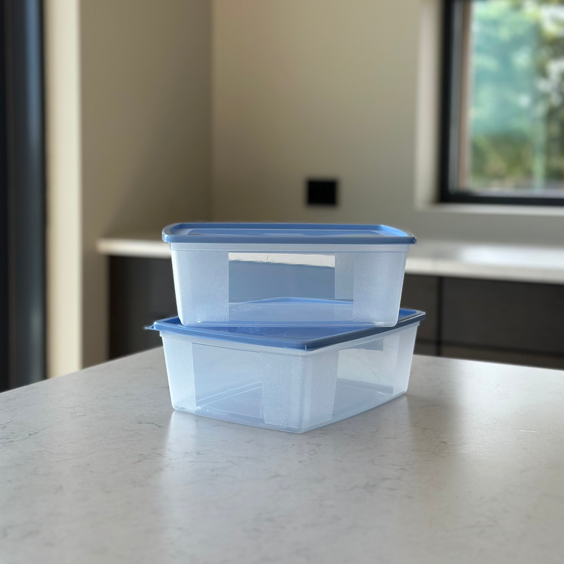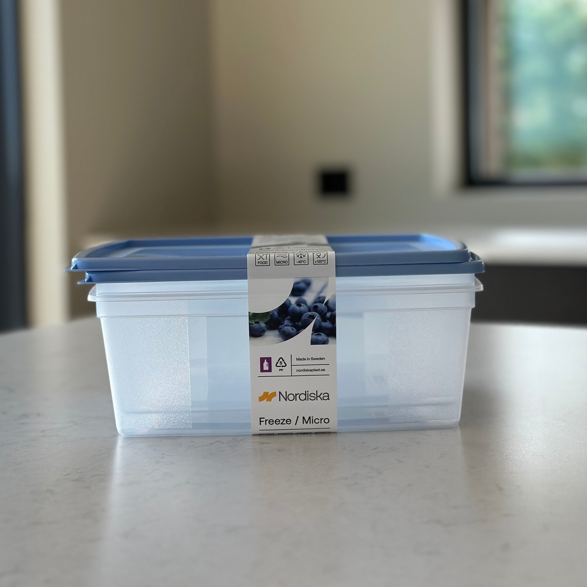 To store 2,5 liter oppbevaringsbokser for mat som tåler temperaturer fra -40 grader til +120 grader. Denne oppbevaringsboksen tåler mikroovn, kjøleskap og fryser.